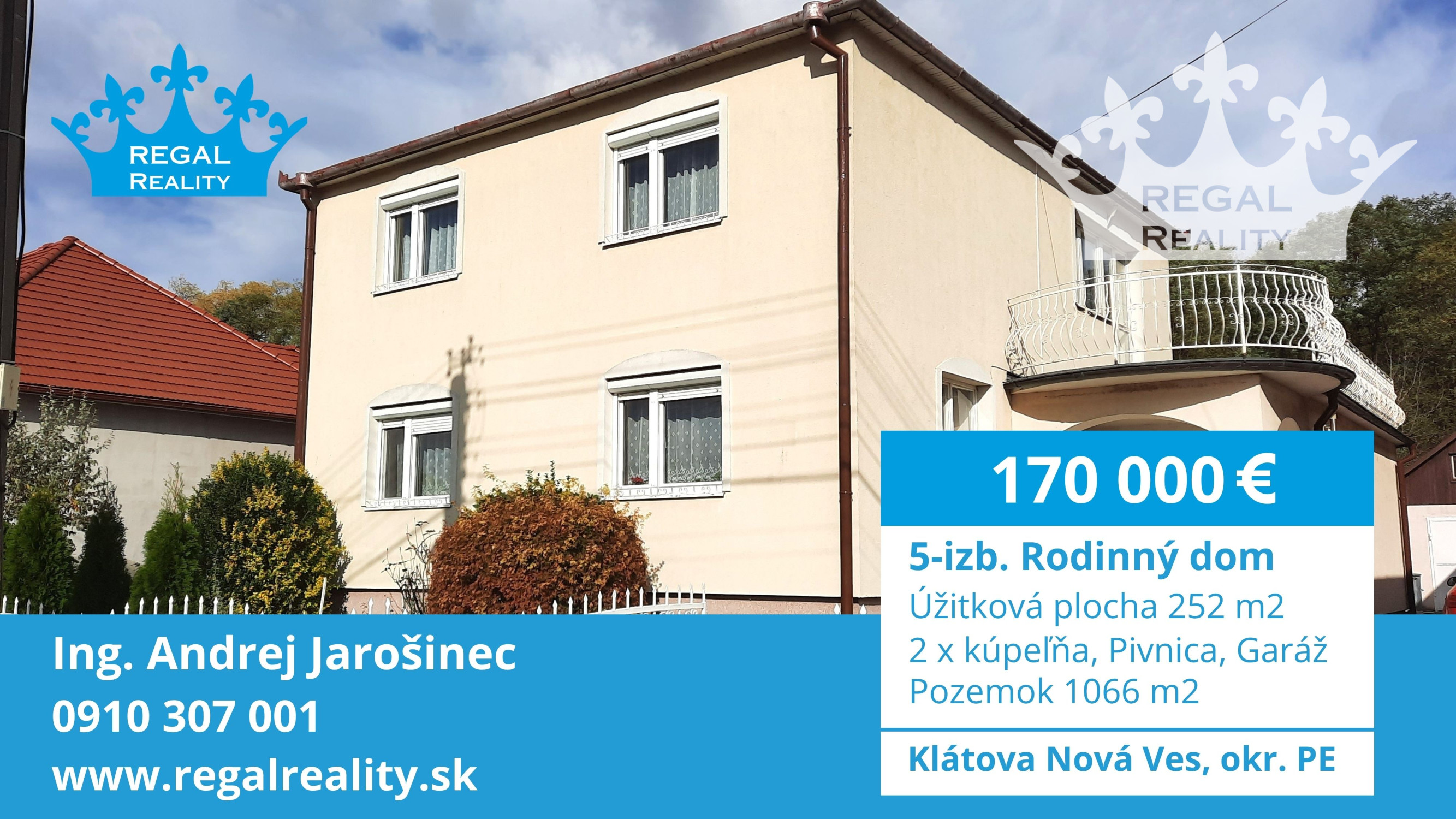 REGAL Reality ponúka výhradne na predaj dvojpodlažný zrekonštruovaný 5-izbový rodinný dom v obci Klátova Nová Ves,  okr. Partizánske. Rodinný dom má zastavanú plochu 151 m2 a je postavený na pozemku o rozlohe 1066 m2. Dom postupne od r. 2002 do r. 2009 prešiel rekonštrukciou: okná, elektrika, stierky podlahy, dlažby obklady. Dom je kompletné zateplený – polystyrén.
