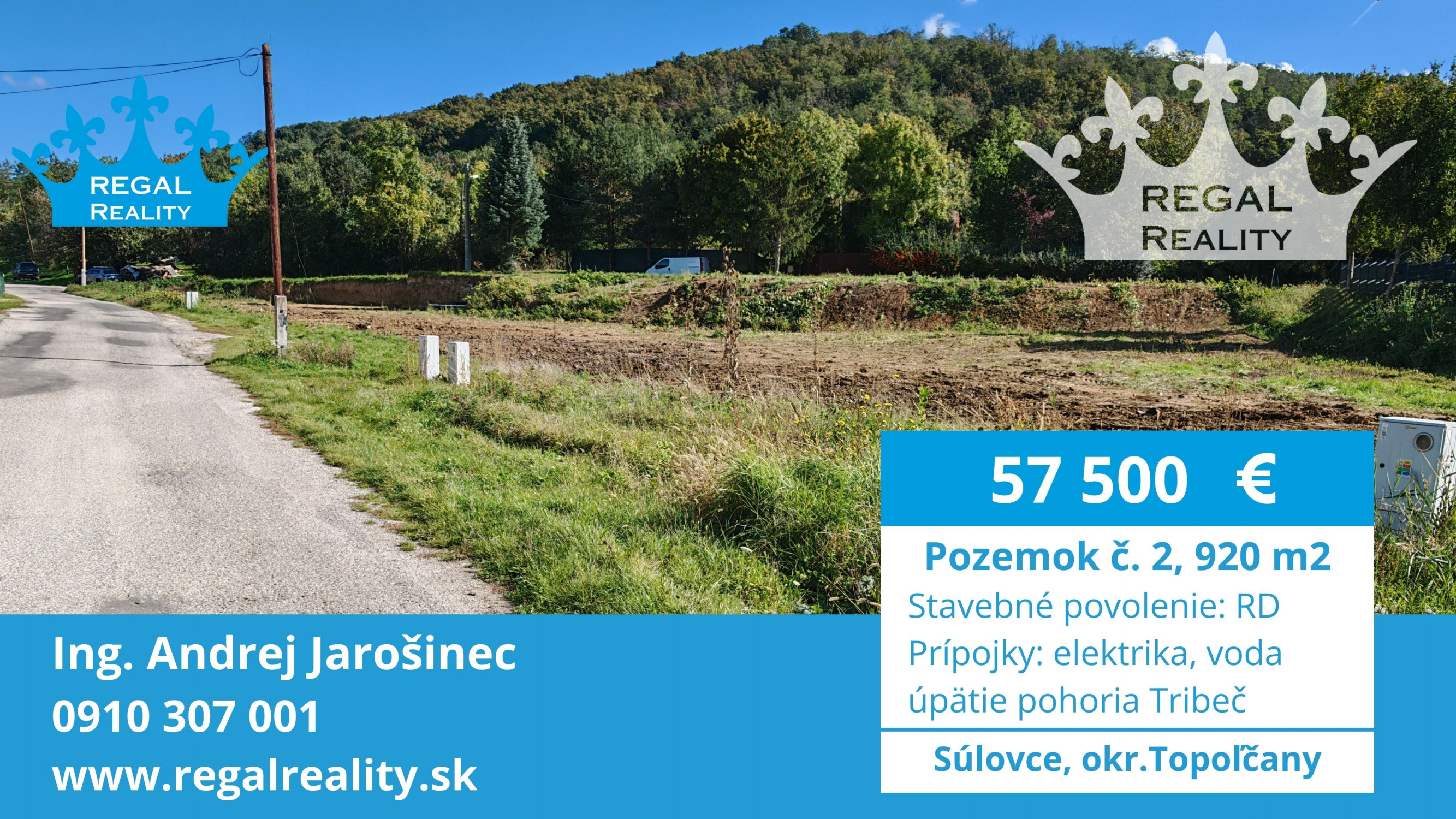 REGAL Reality ponúka výhradne na predaj stavebný pozemok na výstavbu rodinného domu alebo rekreačnej chaty v obci Súlovce, okr. Topoľčany. Pozemok má rozlohu 920 m2 a nachádza sa v podhorskej časti obce na úpätí pohoria Tribeč. Pozemok má šírku od 14 po 18 m a dĺžku 61-75 m. Prípojky elektriky a vody s vodomerom sú už vybudované na pozemku. K pozemku je vydané stavebné povolenie: výstavba Rodinného domu.