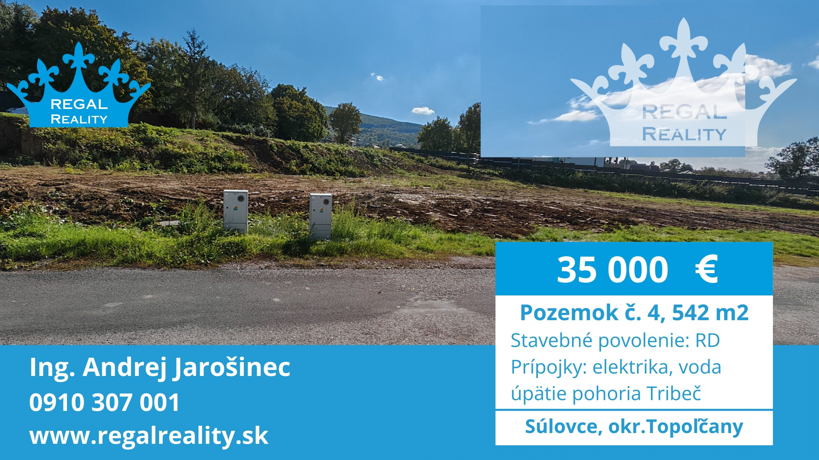 REGAL Reality ponúka výhradne na predaj stavebný pozemok na výstavbu rodinného domu alebo rekreačnej chaty v obci Súlovce, okr. Topoľčany. Pozemok má rozlohu 542 m2 a nachádza sa v podhorskej časti obce na úpätí pohoria Tribeč. Pozemok má šírku od 14 po 18 m a dĺžku 33-46 m. Prípojky elektriky a vody s vodomerom sú už vybudované na pozemku. K pozemku je vydané stavebné povolenie: výstavba Rodinného domu.